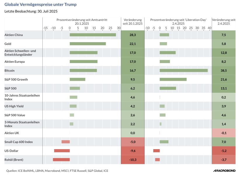 Ebenfalls stark war der Anstieg von wachstumsorientierten US-Aktien (S&P 500 Growth, +21,6%), während klassische Value-Aktien deutlich zurückblieben (S&P 500 Value, 4,6%). Die Märkte honorieren offenbar globale Geschäftsmodelle und Innovationskraft – auch im Umfeld zunehmender Handelskonflikte. Dies gilt auch für Aktien aus Schwellen- und Entwicklungsländern, die auch nach den Zollankündigungen vom 2. April an Wert zulegten (+12,8%). Allerdings in etwas geringerem Ausmaß als seit der Amtsübernahme von Trump (+17%).
