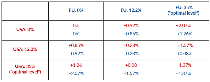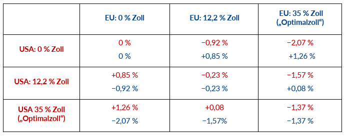 Um das Handelsabkommen insgesamt zu bewerten, reicht es nicht aus, seine Auswirkungen mit einer Situation zu vergleichen, wie wir sie vor Trump kannten. Vielmehr müssen wir das Handelsabkommen mit anderen Szenarien vergleichen, die in unserer jetzigen Welt wahrscheinlich wären. Dazu verwenden wir eine Variante des gebräuchlichsten Modells der Außenhandelstheorie – das Melitz-Modell – und simulieren verschiedene Kombinationen von Zollstrategien, die zwischen den USA und der EU als Ergebnis von Verhandlungen oder eines Handelskonflikts möglich wären. Die Ergebnisse sind in Tabelle 1 zusammengefasst: Hier sind Veränderungen des realen BIP für beide Regionen (USA in rot, EU in blau) im Vergleich zu einem Basisszenario ohne Zölle dargestellt.