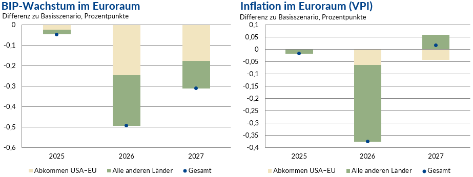 Grafik 1 zeigt klar: Das Handelsabkommen zwischen den USA und der EU (beiger Balken) verringert das BIP-Wachstum des Euroraums 2026 um etwa 0,25 Prozentpunkte und senkt die Inflation aufgrund der Wachstumsabschwächung leicht um 0,06 Prozentpunkte. Bezieht man die US-Zölle gegenüber anderen Ländern, die mit 1. August in Kraft sind, ebenfalls in die Berechnung mit ein, verliert der Euroraum weitere 0,25 Prozentpunkte beim Wachstum (grüner Balken). Die Inflation sinkt um weitere 0,31 Prozentpunkte. Das bedeutet, dass ohne diese Zölle das Wirtschaftswachstum des Euroraums im nächsten Jahr um etwa einen halben Prozentpunkt höher ausfallen würde.
