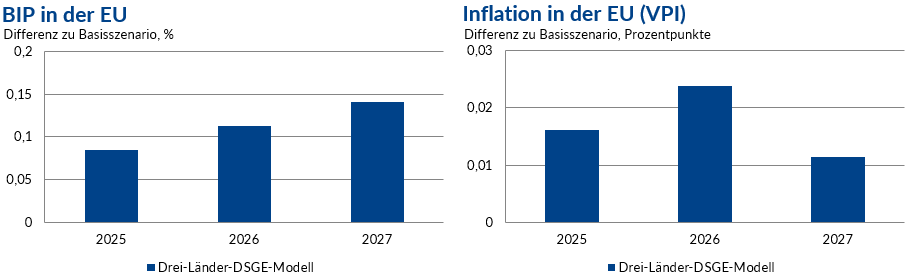 Abgesehen von den direkten Auswirkungen der US-Zölle könnte Europa auch indirekt von den Handelsspannungen zwischen den USA und China betroffen sein. Um diese indirekten Auswirkungen zu beziffern, verwenden wir ein dynamisches Drei-Länder-Modell, das vom Referat International Economics der OeNB entwickelt wurde. Mit diesem Modell simulieren wir eine dauerhafte Erhöhung der Handelskosten zwischen den USA und China um 40 %, was in etwa dem Status quo entspricht.