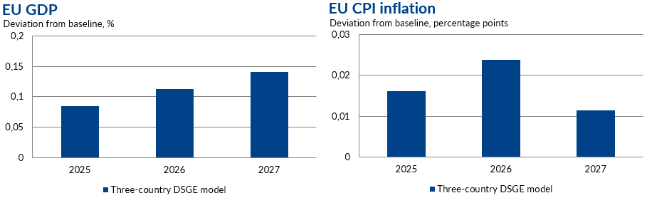 The increase in EU exports also has slightly beneficial implications for GDP growth and raises inflation, but only by a small amount. Thus, the trade tensions between the USA and China can benefit Europe to some degree, making it a more attractive trading partner by comparison, but the effects on the economy as a whole are very small.
