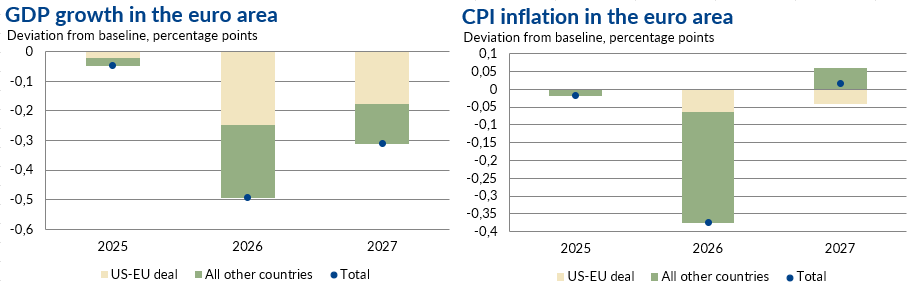 Chart 1 clearly shows: The US-EU trade deal (beige bars) reduces euro area GDP growth by approximately 0.25 percentage points in 2026 and slightly lowers inflation by 0.06 percentage points due to the economic slowdown. When we include the broader set of US tariffs on other countries as in place since August 1 (green bars), the euro area loses an additional 0.25 percentage points in growth and 0.31 percentage points in inflation. That means that, without these tariffs, overall euro area growth would be half a percentage point higher next year.