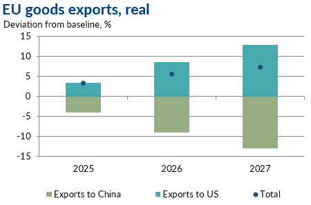 The model predicts that EU exports to the US will increase (chart 2, light blue bars), while exports to China will decline (green bars). This is driven by several factors: falling GDP in China and the US reduces demand for European exports. At the same time, Europe becomes more attractive as a trading partner, because of lower trade barriers. Additionally, the Chinese renminbi will depreciate, reducing European exports to China. Overall, total EU exports will rise (blue dots), since the USA is a more important trading partner than China.