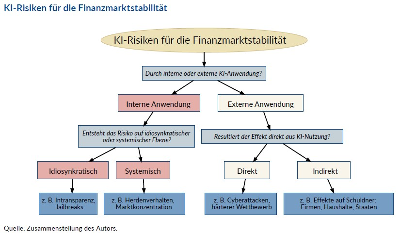 Ein Vergleich der Studien zeigt auch, dass es noch keine gemeinsame Terminologie oder Klassifizierung von KI-Risiken gibt. Das nachstehende Schaubild versucht, die vielen KI-Risiken im Finanzsektor systematisch darzustellen. Dabei wird zuerst unterschieden, ob ein Risiko durch eine KI-Anwendung innerhalb oder außerhalb des Finanzsektors entsteht. Bei internen KI-Anwendungen wird unterschieden zwischen Risiken, die nur im systemischen Kontext entstehen, also in Zusammenschau mit den Handlungen anderer Marktteilnehmer (wie Marktkonzentration oder Herdenverhalten), und Risiken, die auch bei isolierter Betrachtung entstehen können, also ohne die Handlungen anderer Marktteilnehmer in Betracht zu ziehen (wie Intransparenz und Cyberrisiken). Bei externen KI-Anwendungen wiederum lässt sich unterscheiden zwischen solchen, die sich direkt auf die Finanzmarktstabilität auswirken, und solchen, die sich indirekt auswirken.