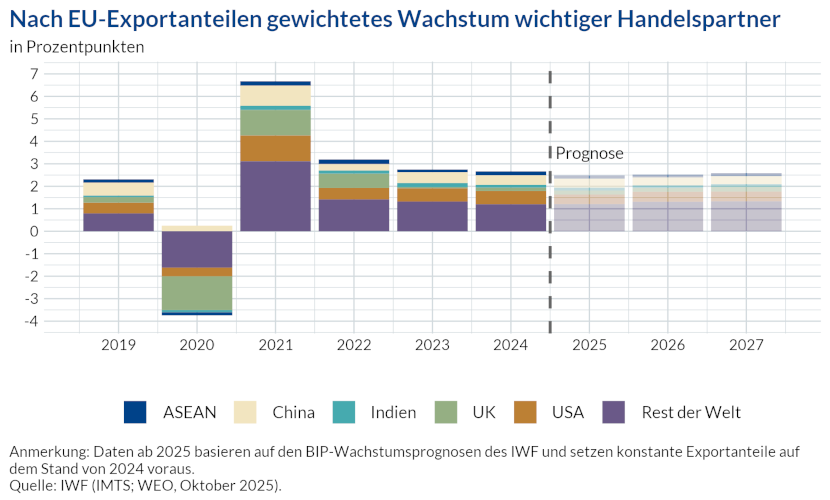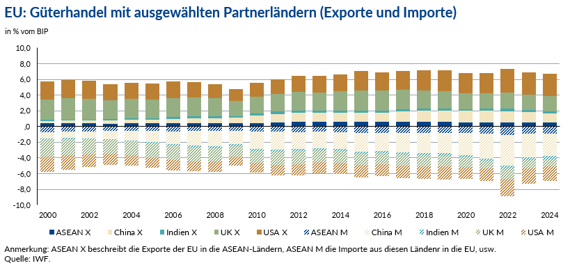 Insgesamt deutet die Grafik auf einen allmählichen Übergang hin: Der angelsächsische Raum bleibt für den EU-Außenhandel prägend, doch die wachsende wirtschaftliche Dynamik in Asien erhöht die relative Bedeutung Asiens für die Wachstumsdynamik des europäischen Außenhandels.