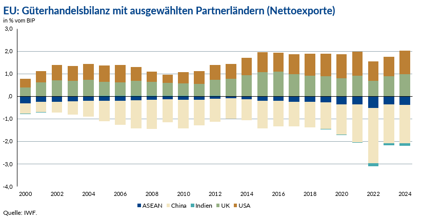 Grafik 1 zeigt die Entwicklung der Güterhandelsbilanz (netto) der EU mit ausgewählten Partnerländern – USA, UK, China, Indien und den ASEAN-Staaten – in Prozent des EU-BIP von 2000 bis 2024. Der angelsächsische Raum (USA und UK) leistet über den gesamten Zeitraum hinweg klar den größten positiven Beitrag zur EU-Handelsbilanz, wenn auch zuletzt mit leicht sinkender Tendenz.