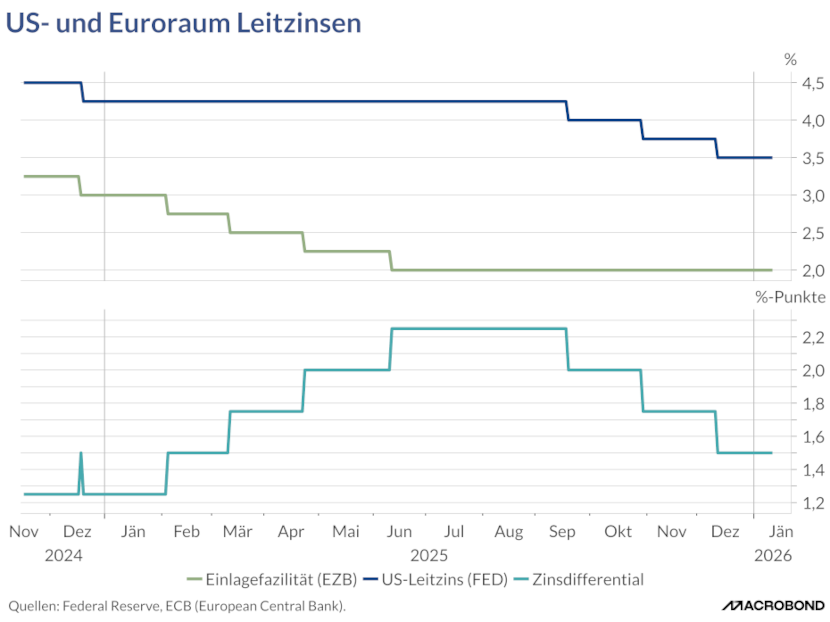 Grafik 1 zeigt, wie sich die Leitzinsen in den USA und im Euroraum zuletzt entwickelt haben und wie groß der Abstand zwischen ihnen ist. Gegen Jahresende 2025 ist der Zinsabstand zwischen den beiden Währungsräumen kleiner geworden (die EZB hielt ihre Zinsen stabil, während die Fed die ihren gesenkt hat). Sinkende Zinsdifferenzen können die Attraktivität von US-Dollar-Anlagen mindern.