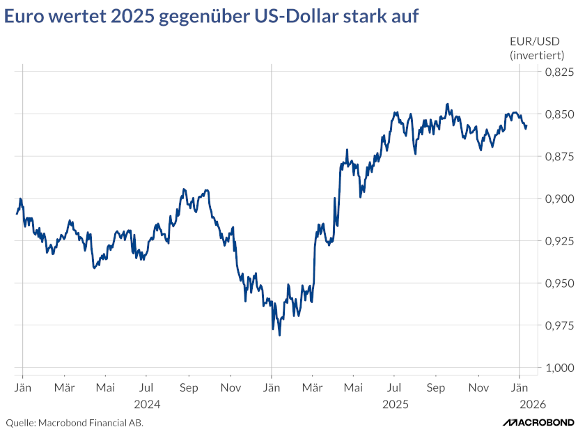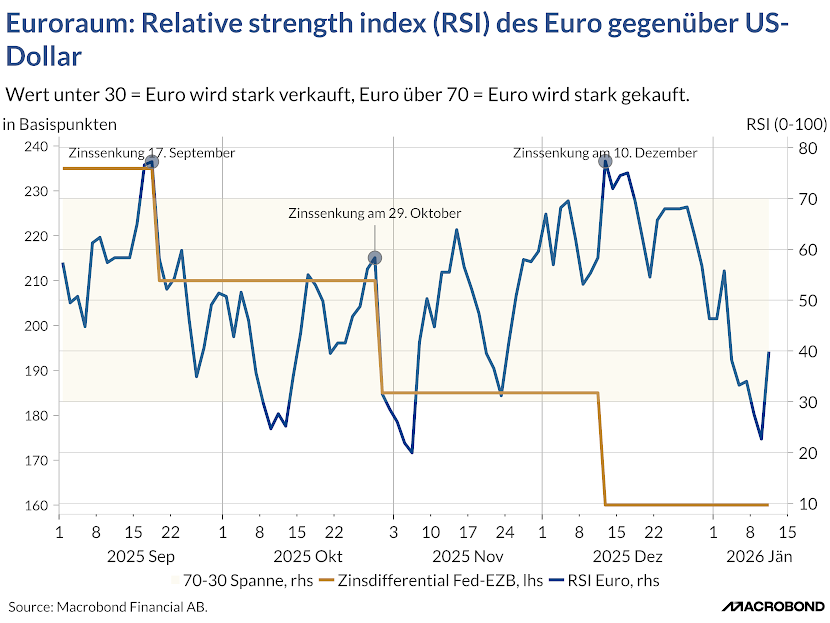 Besonders aufschlussreich ist der Verlauf des MACD (Grafik 4). Ende Dezember ist dieser über seine Signallinie gestiegen – ein Hinweis darauf, dass sich die Aufwertungsbewegung des Euro nicht nur kurzfristig verstärkt hat, sondern von einer breiteren Neubewertung getragen wird. Dass sich der MACD selbst weiter in Richtung positiver Bereich bewegt, spricht dafür, dass die Märkte den geldpolitischen Kurswechsel in den USA nicht als vorübergehendes Ereignis betrachten, sondern als möglichen Beginn einer veränderten Erwartungslage.