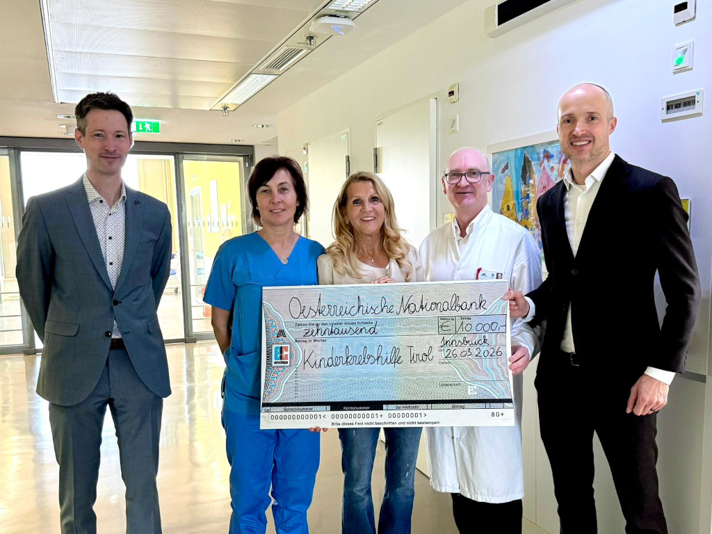 Einen sehr emotionalen und bewegenden Moment stellte die Spendenübergabe Ende März 2026 an die Kinderkrebshilfe Tirol & Vorarlberg dar. Der erfolgreiche Umtausch alter Bankennoten und Münzen aus der Spendenbox im 1. Quartal 2026 ergab einen Gegenwert von 5.000 Euro. Dieser Betrag wurde vom OeNB-Direktorium verdoppelt, sodass in Summe eine sehr großzügige Spende von 10.000 Euro übergeben werden konnte. Die finanziellen Mittel kommen betroffenen Familien zugute, die infolge der Krankheit ihres Kindes z.B. durch anfallende Therapie- und Pflegekosten vielfach vor existenziellen Herausforderungen und nicht selten vor finanziellen Notlagen stehen.