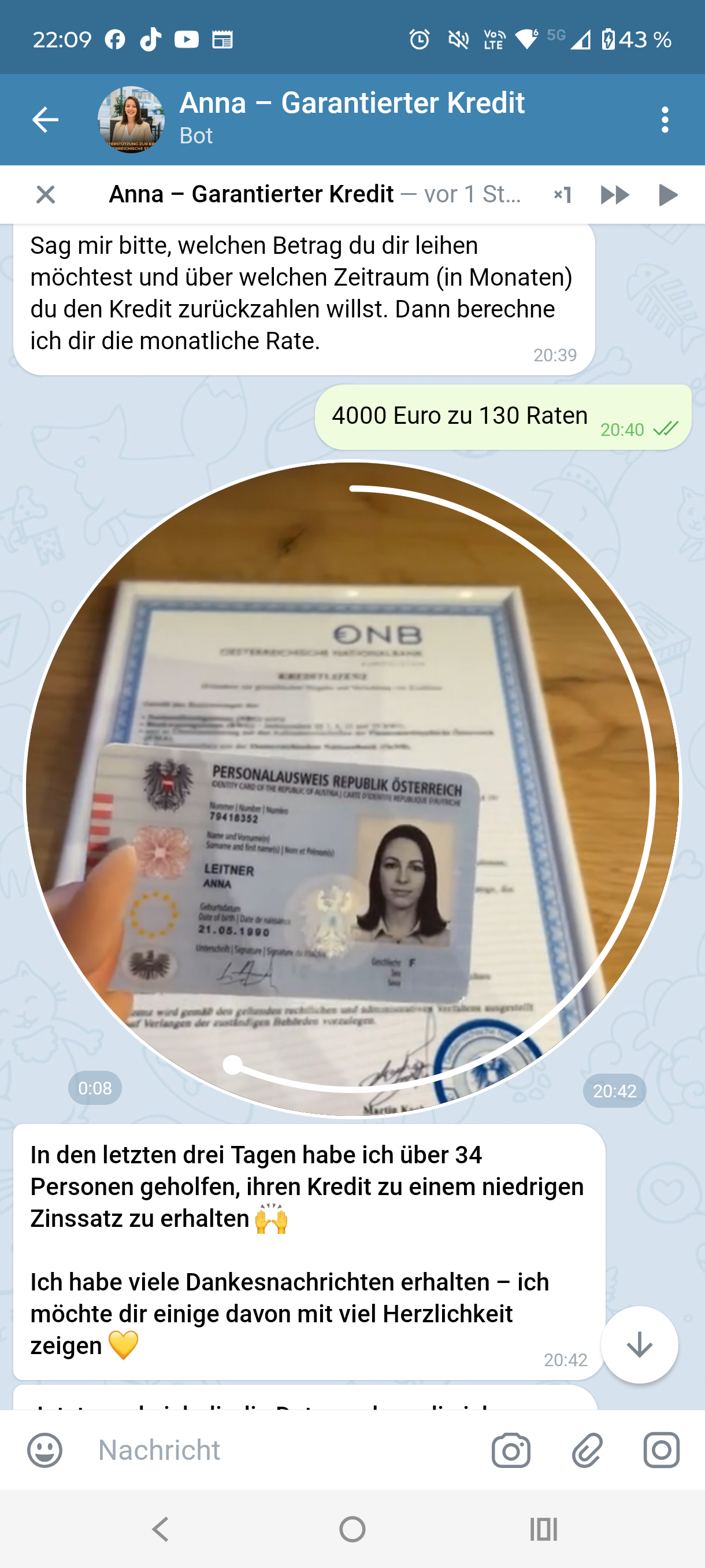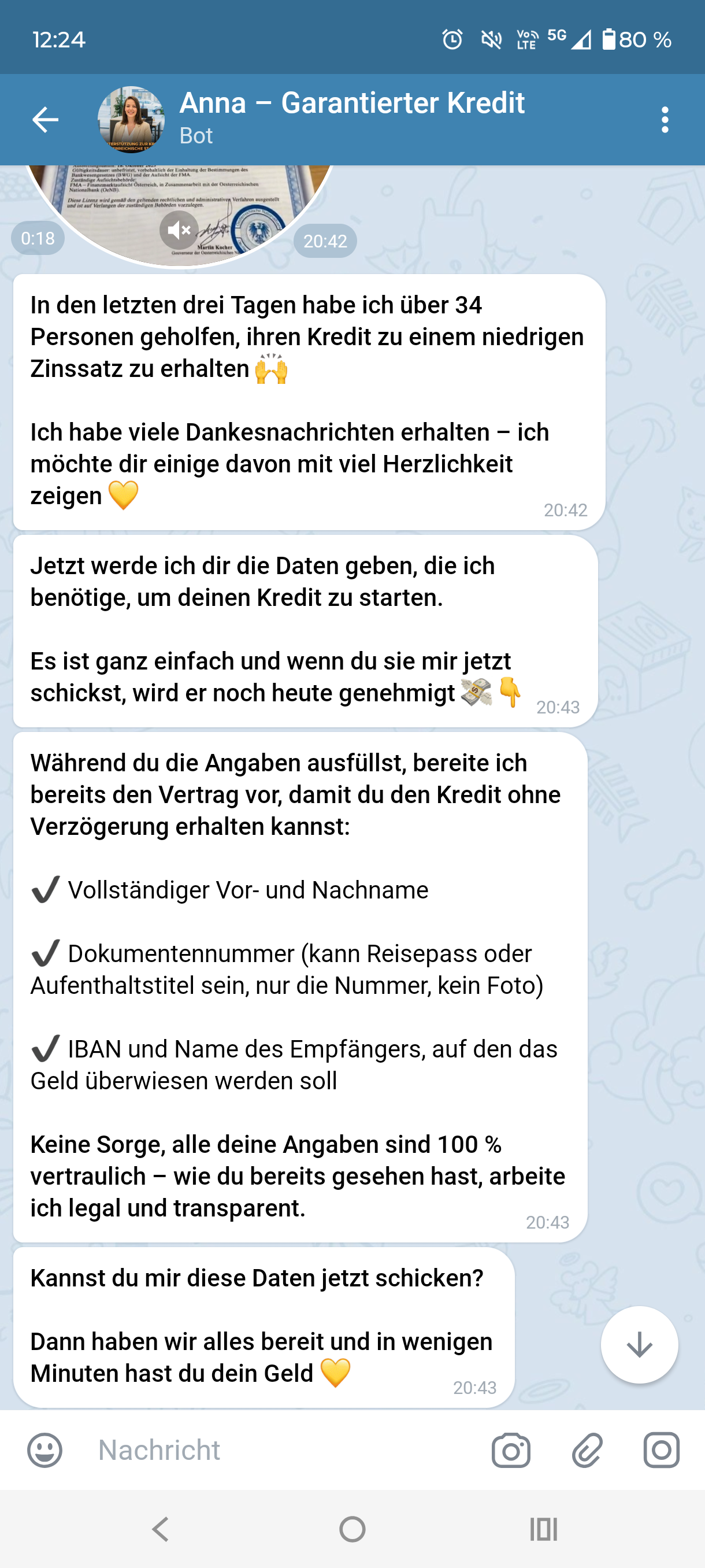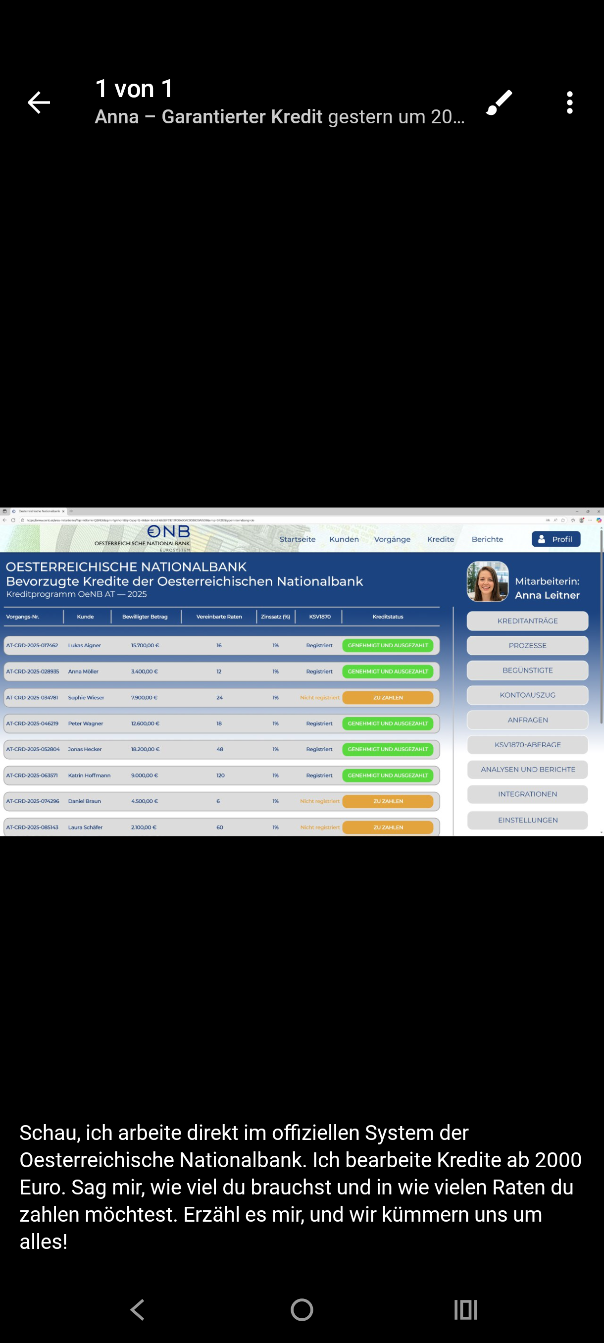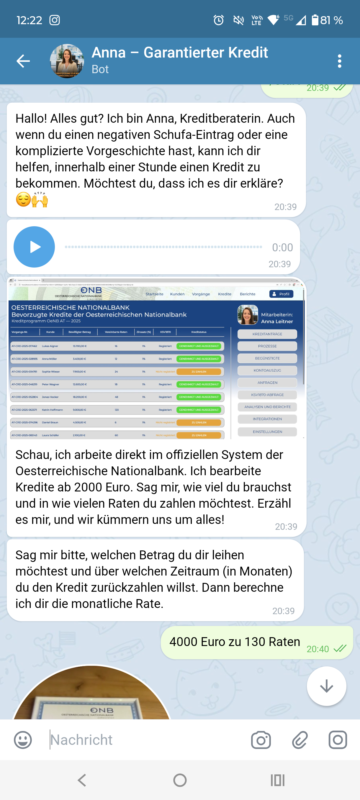 Im Moment werden via Telegram Nachrichten verschickt, in denen Personen ein angebliches Kreditprogramm der OeNB angeboten wird. Als Beilagen werden Screenshots des vermeintlichen Kreditportals sowie ein Vertragsdokument in Form eines pdf-Dokuments mitgeschickt. Auf diesem befindet sich das Logo der OeNB, das rechtswidrig verwendet wird. Es wird darüber hinaus eine Servicegebühr in Höhe von 150 Euro verlangt, die über eine weitere Fake-Website zur Zahlung auffordert.