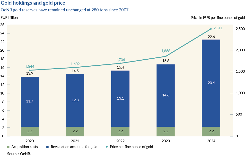 Gold has traditionally served, and continues to serve, as an important store of value, allowing central banks to diversify their reserve assets. Hence, gold also represents a key reserve asset for the OeNB. The gold held by all euro area central banks combined is part of the Eurosystem’s reserve assets and thus helps stabilize the euro. In terms of the Eurosystem’s overall gold reserves, the OeNB’s current gold holdings roughly correspond to the OeNB’s share of the ECB’s capital. From a monetary policy perspective, the volume of gold held by the OeNB is deemed to be appropriate relative to the size of both its total reserve assets and the Austrian economy.