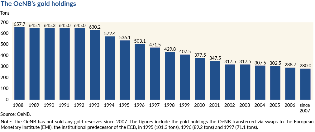 In the 1990s, the OeNB’s gold holdings decreased, as around 22 tons were put into custody with the ECB and, in addition to that, the OeNB sold part of its gold. Since 2007, the OeNB’s gold reserves have remained unchanged at 280 tons.